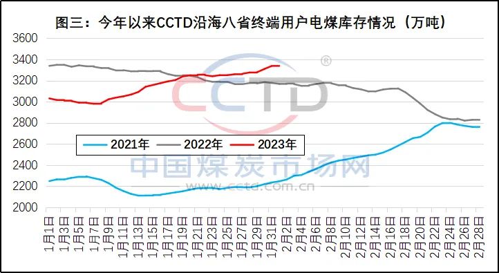 另一方(fāng)面,今年12月7日,“CCTD沿海(hai)八省動力煤終端(duān)用戶數據”所覆💚蓋(gai)🈲發電企業的電煤(méi)庫存為3338.4萬噸、同比(bǐ)增加👈170.5萬噸♻️,處于近(jin)幾年同期高位(見(jian)圖三),當天的庫存(cun)可用天數‼️為21.5天,也(yě)處于偏高狀态。